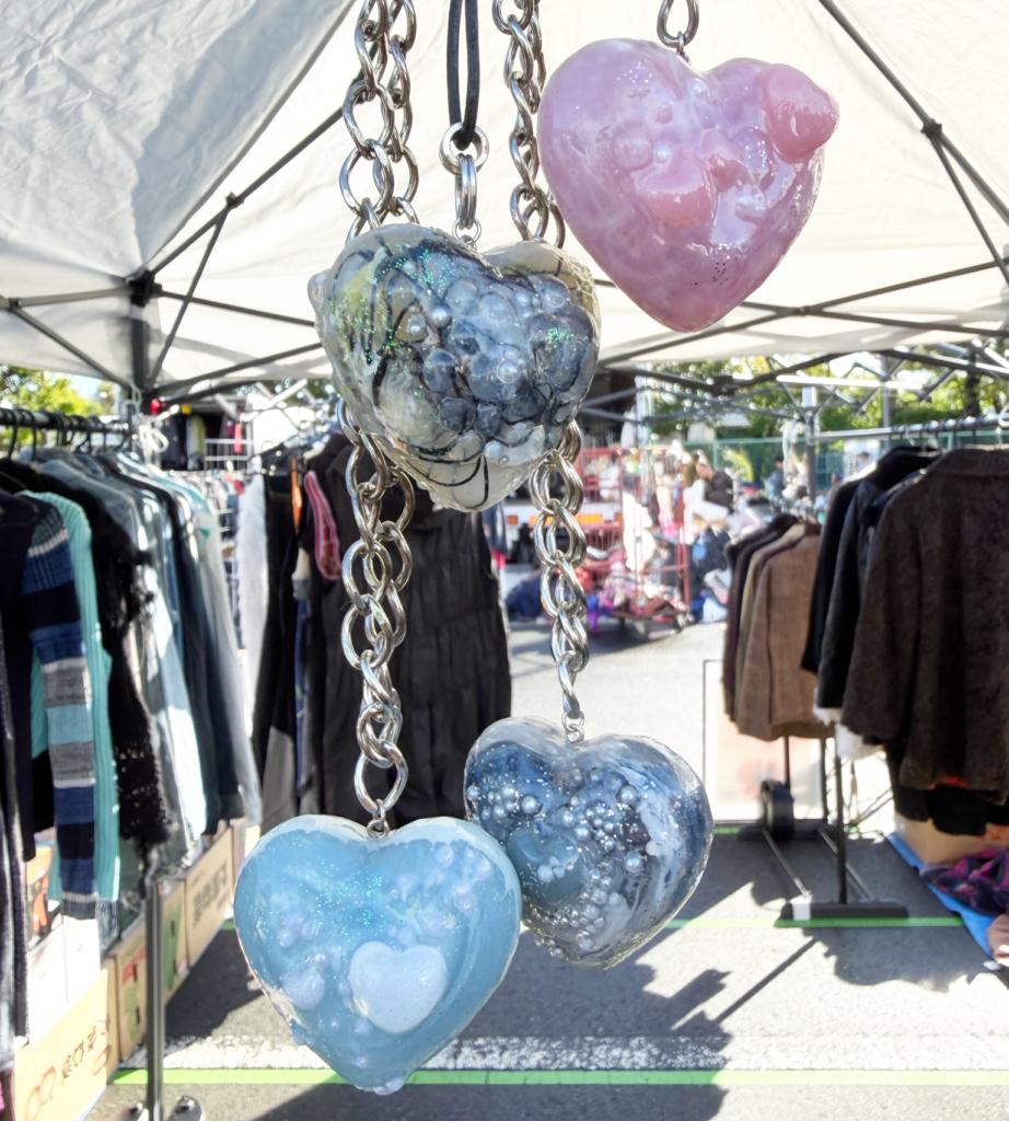통통하고 입체적인 레진 하트 참이 포인트로, 다른 참들은 실버로 통일되어 심플하면서도 존재감 있는 디자인을 완성했습니다.